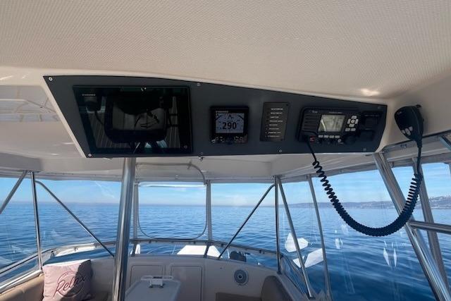 Furuno 12” TZ touch and 9” Furuno display, Chart Plotter, Radar, 2k sounder, FLIR, autopilot, Icom vhf, AIS receiver with stealth mode switch, chain counter, windless control, Fusion MS 770 remote control and sound with Polk Audio bass sub woofer and Fusion speakers. LED Imtra blue/ white lights overhead, remote controlled Spot light, and hailer. RD33 Water temp and vessel data display, EPIRB, Liferaft.