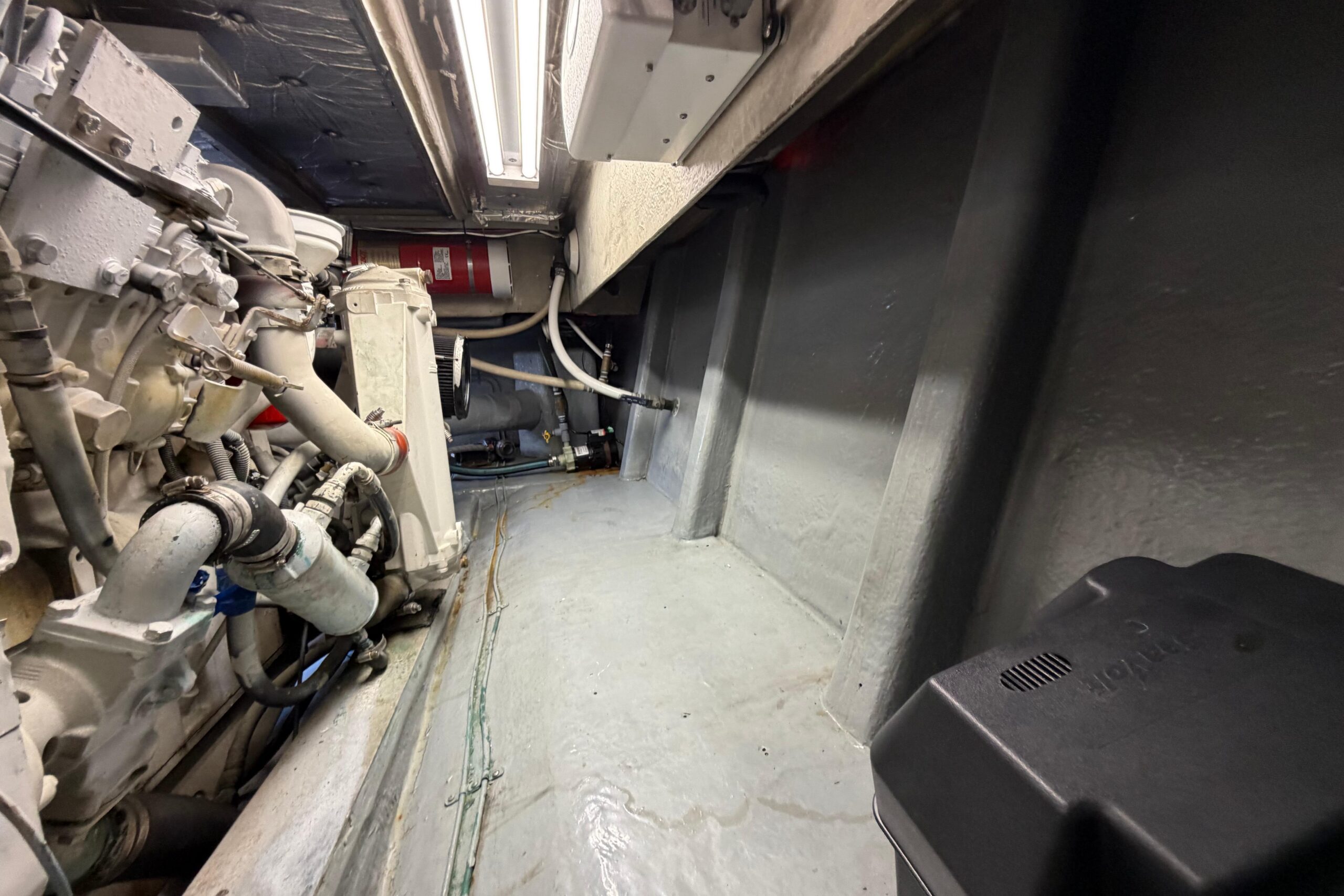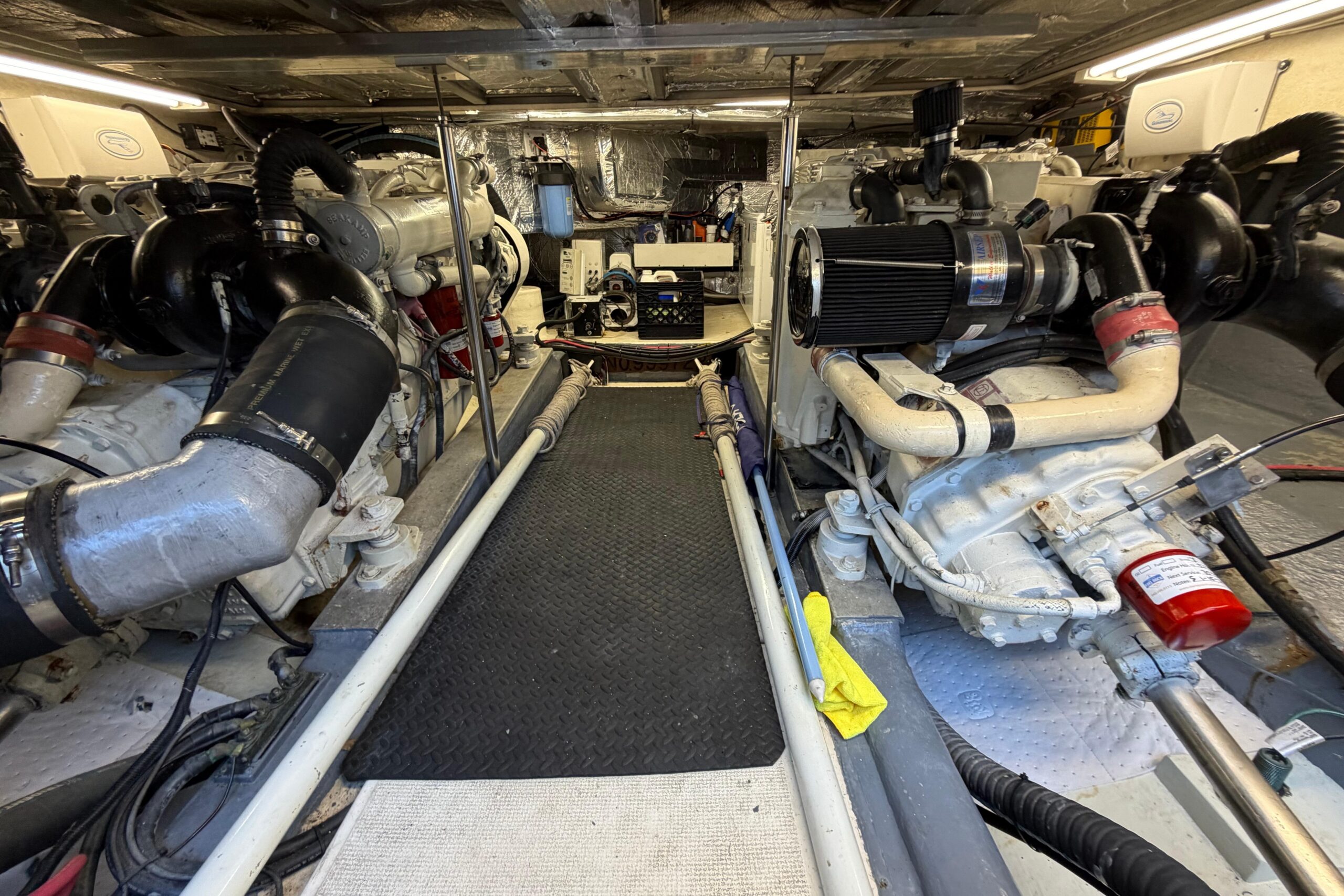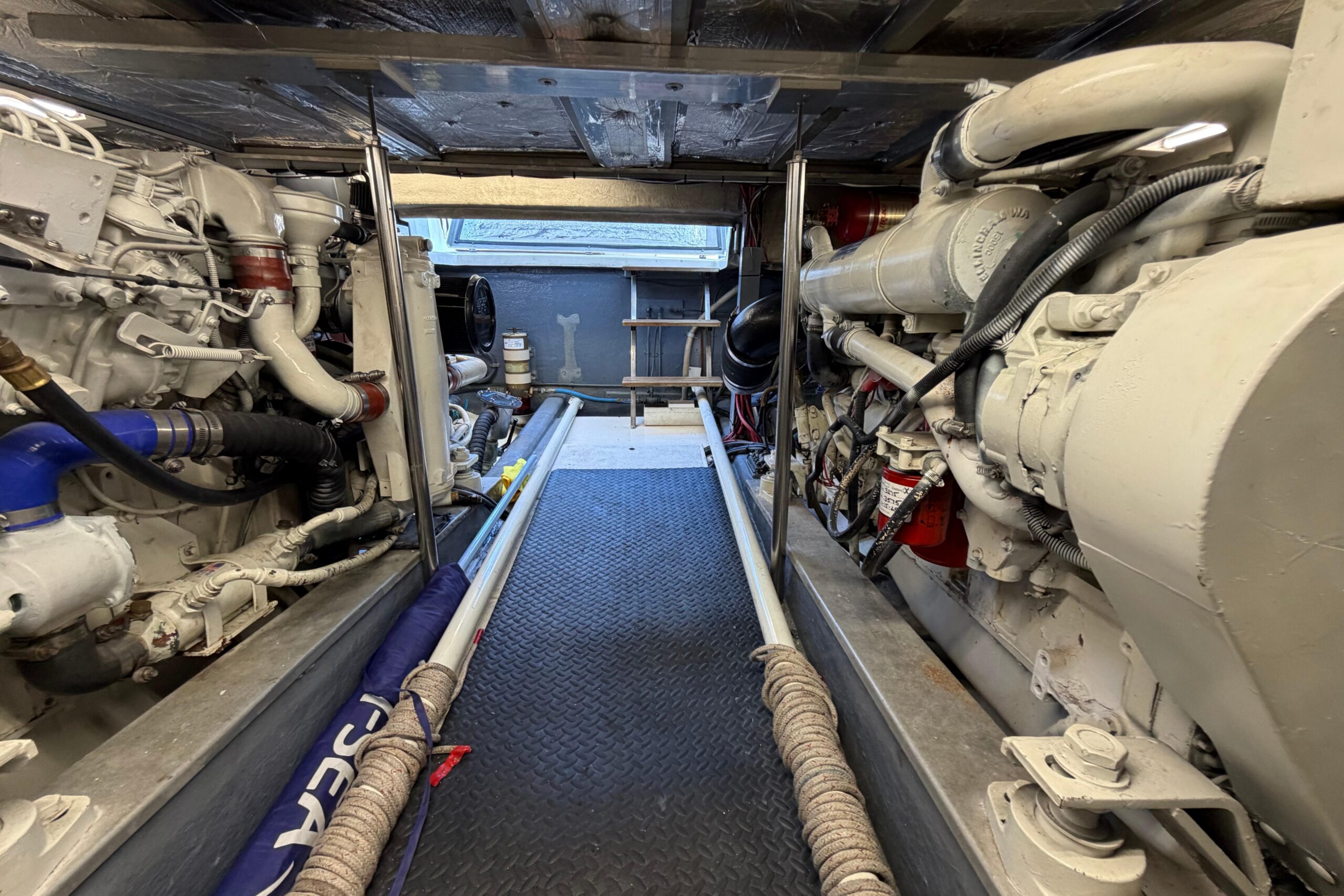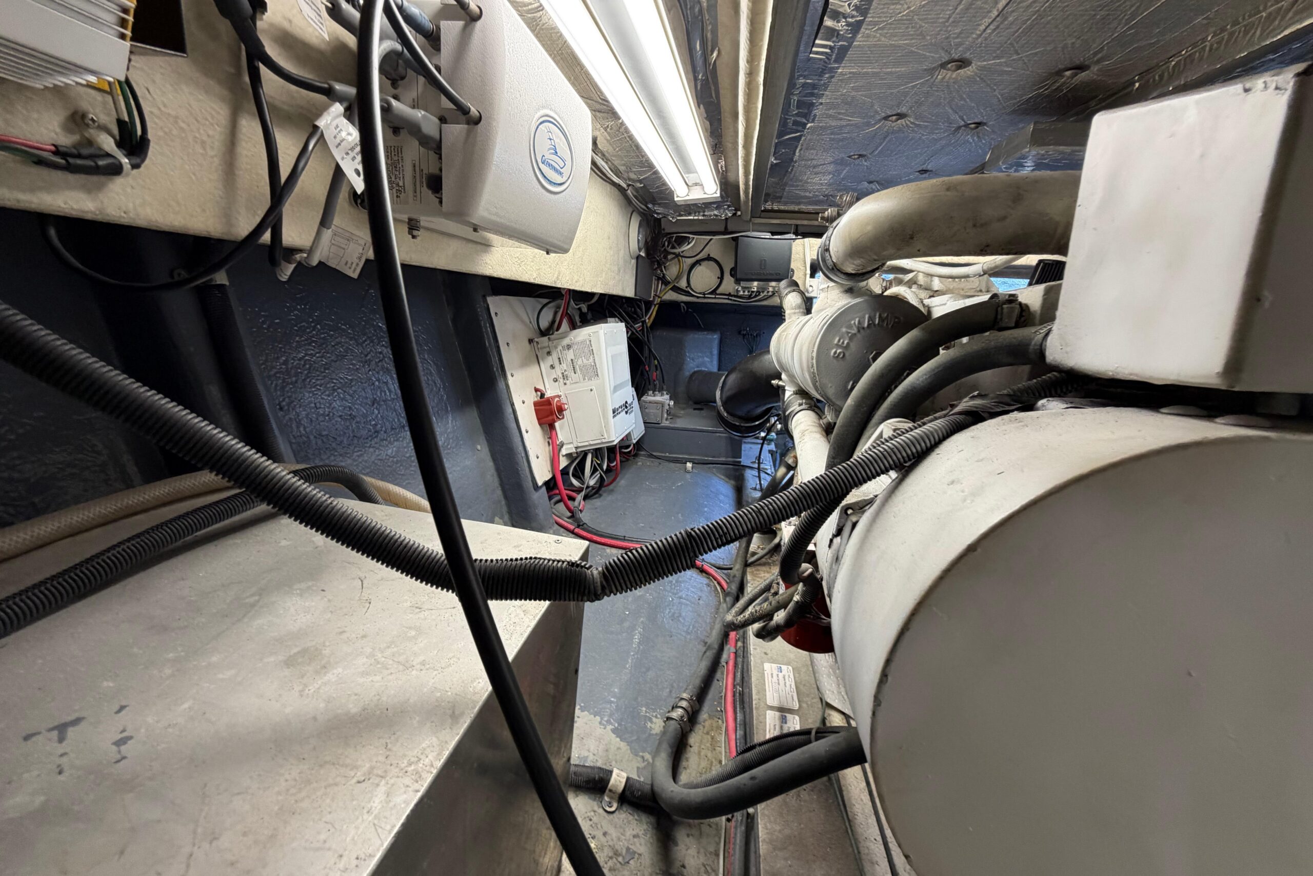 Port and starboard dedicated AGM start, dedicated start for generator, 4 AGM house batteries. Oil change convenance hoses for mains. Site gauges for fuel and water.