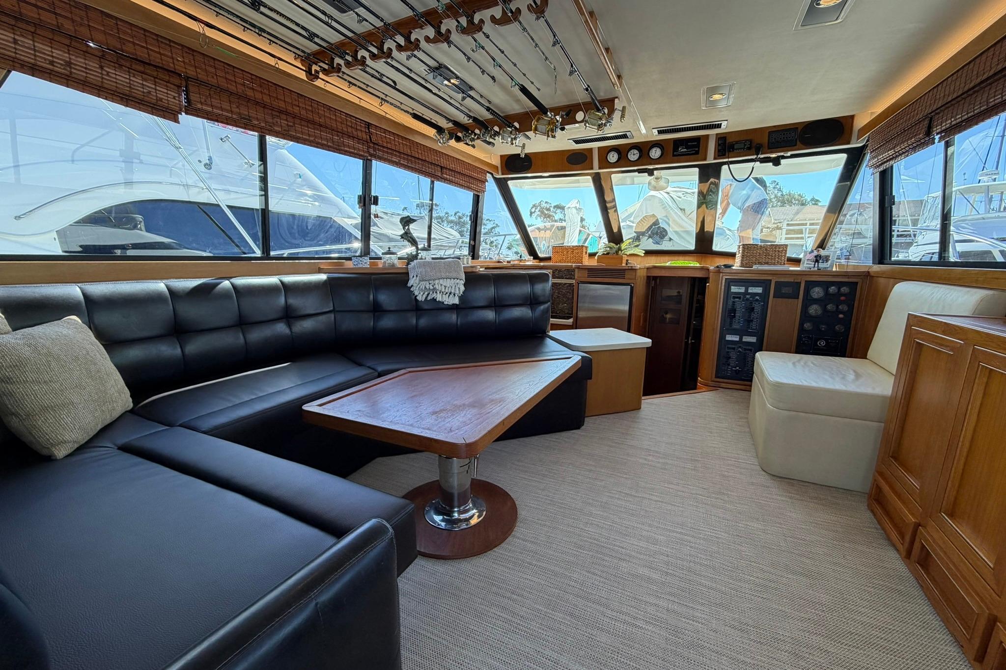Pop-up 43” Sony Bravia Flat Panel TV, surround sound, Fusion MS770 sound system with 1800 Watt Fusion Amp, Polk Audio Sub woofer, 6 speakers/surround sound around salon. Yacht table with Up/Down height adjustment, built in sette with lots of storage under. New Infinity woven vinyl carpet throughout. DC /AC panel, remote generator start switch. 100 Amp AC service. Newer Dometic 3 Zone AC/heat, LED rope and Imtra lights White / Blue dimmable. DVD player, KVH Sat TV, Starlink WiFi throughout.