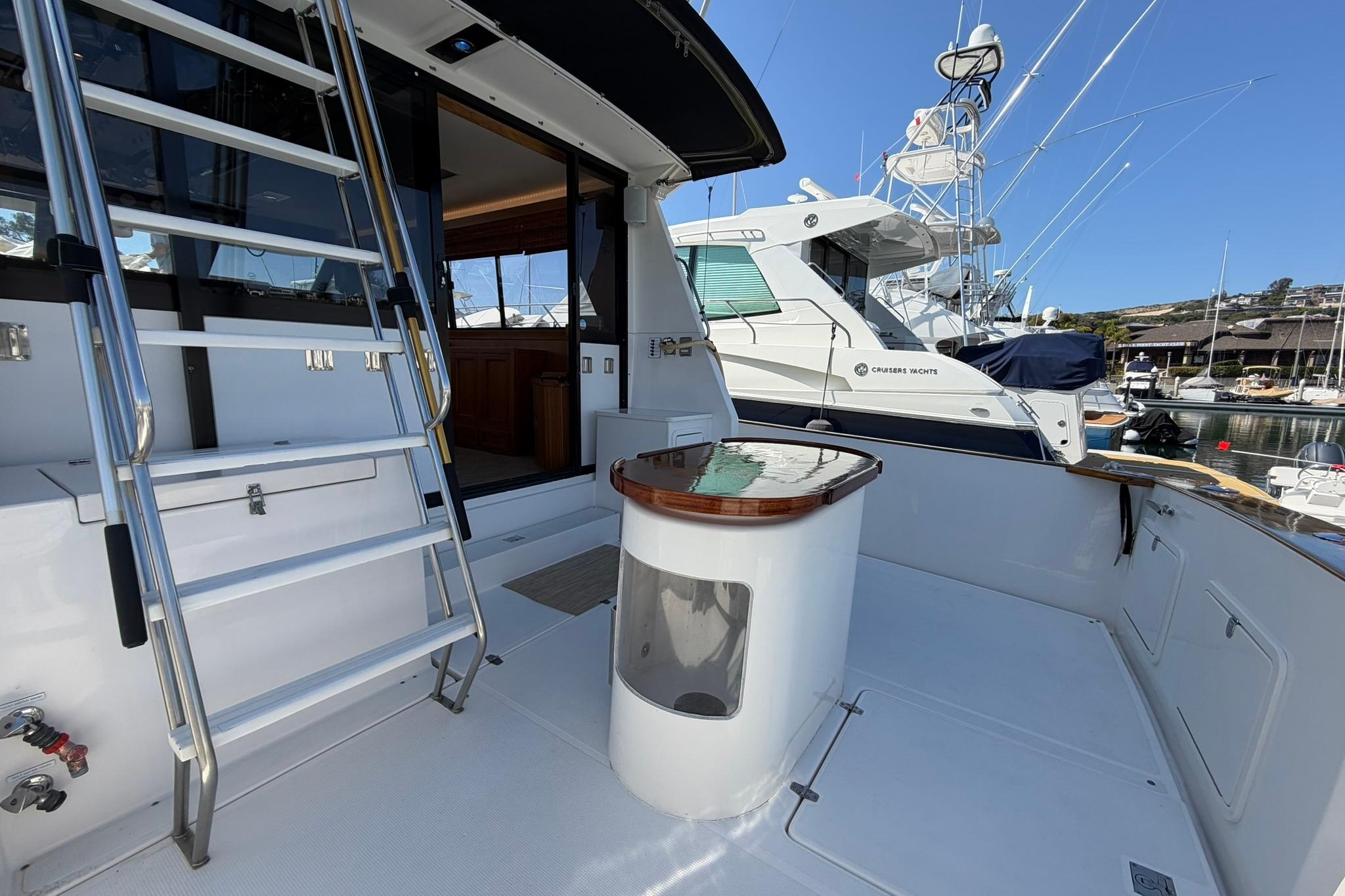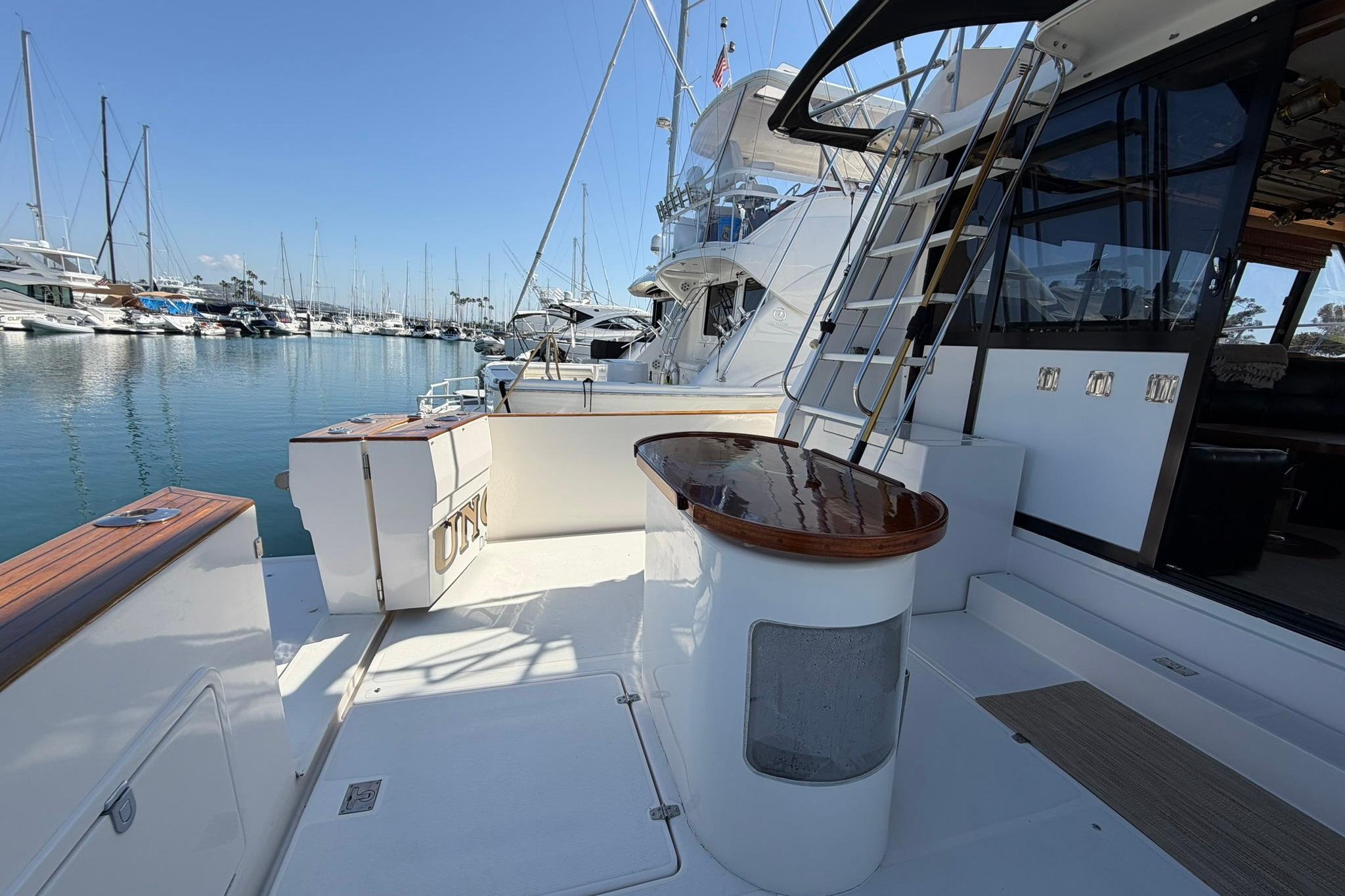 LED Cockpit lights with remote for on off from dinghy. Bait tank with custom rod holders, removable bait tank. Custom teak bait tank table top that is removable. Cockpit Freezer/ refer. Tackle and other storage cabinet, Pompanette Outriggers with Maximizers. Rod holders, BBQ, 3 large storage lockers. 5 Sea-blaze Underwater lights Blue/White, swim step with under mount swim ladder.