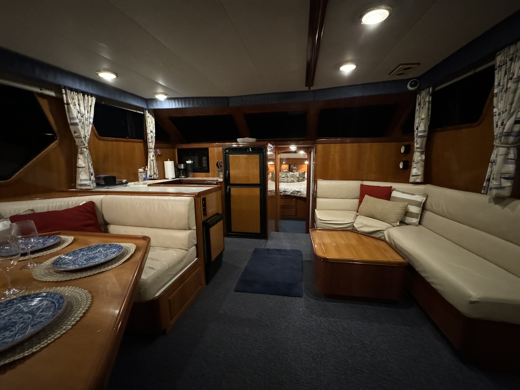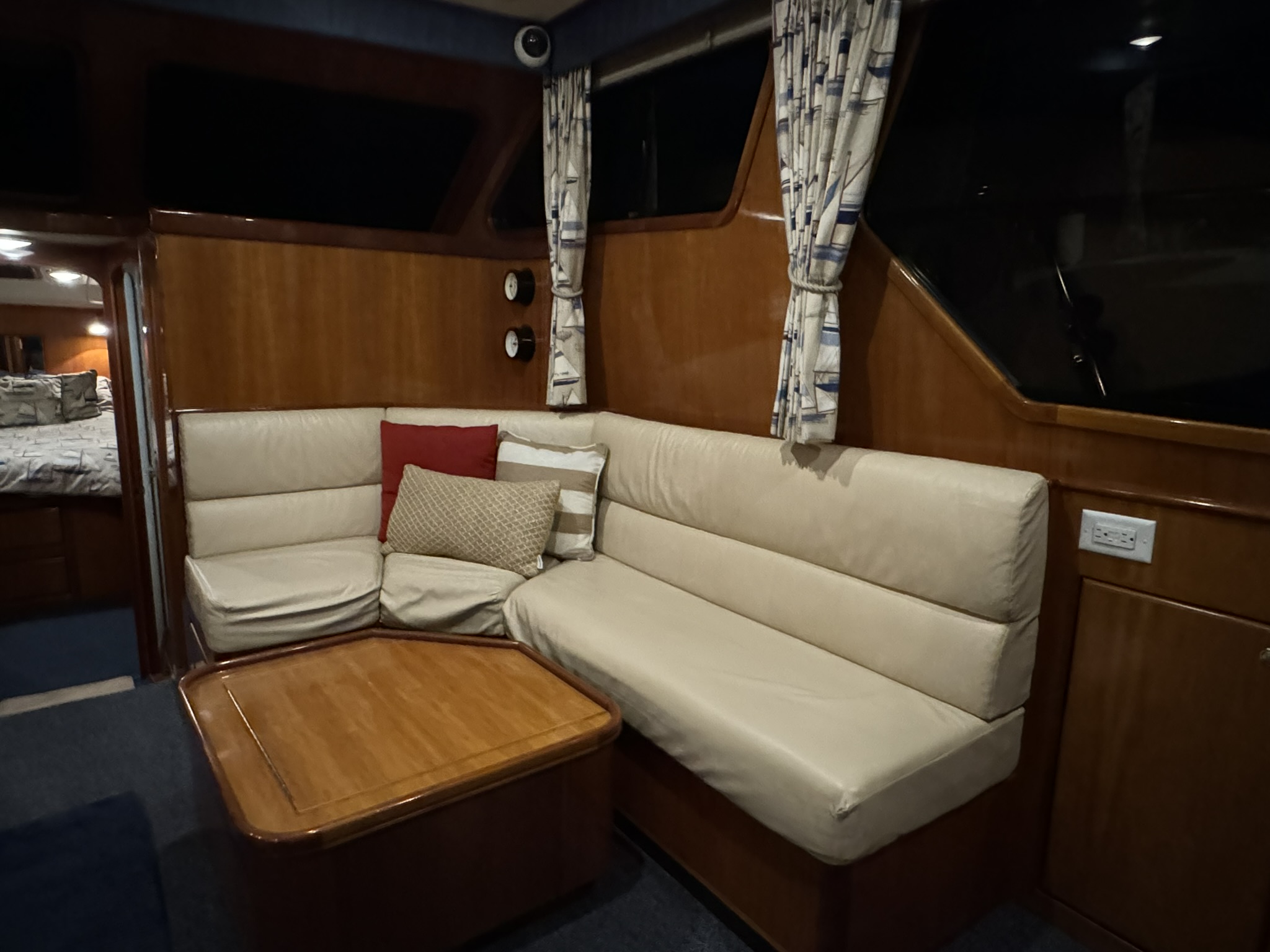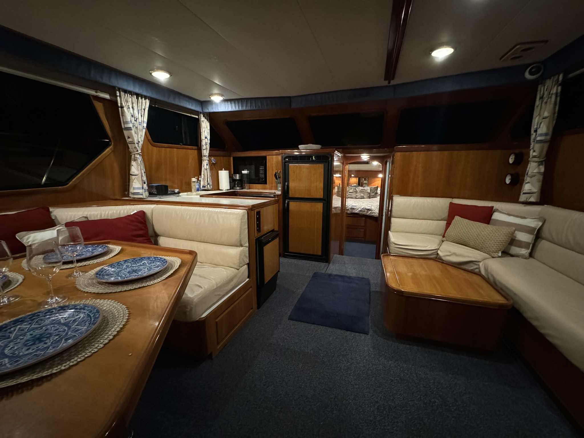 - Massive salon w/360-degree windows, U-shaped dinette (converts to berth) & L-shaped settee (converts to berth), entertainment center & large under-salon utility room