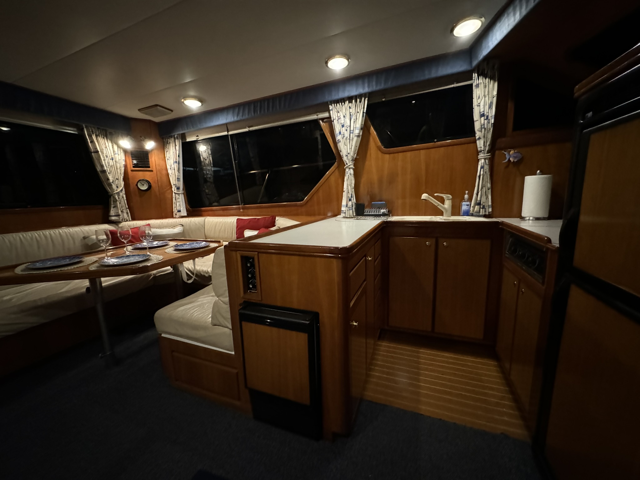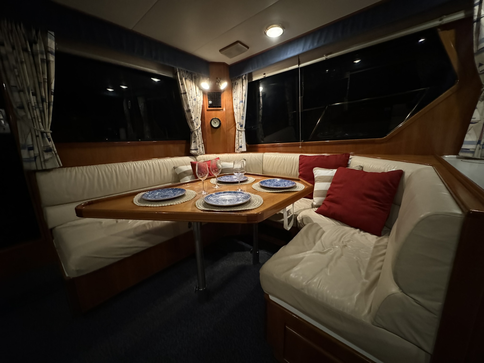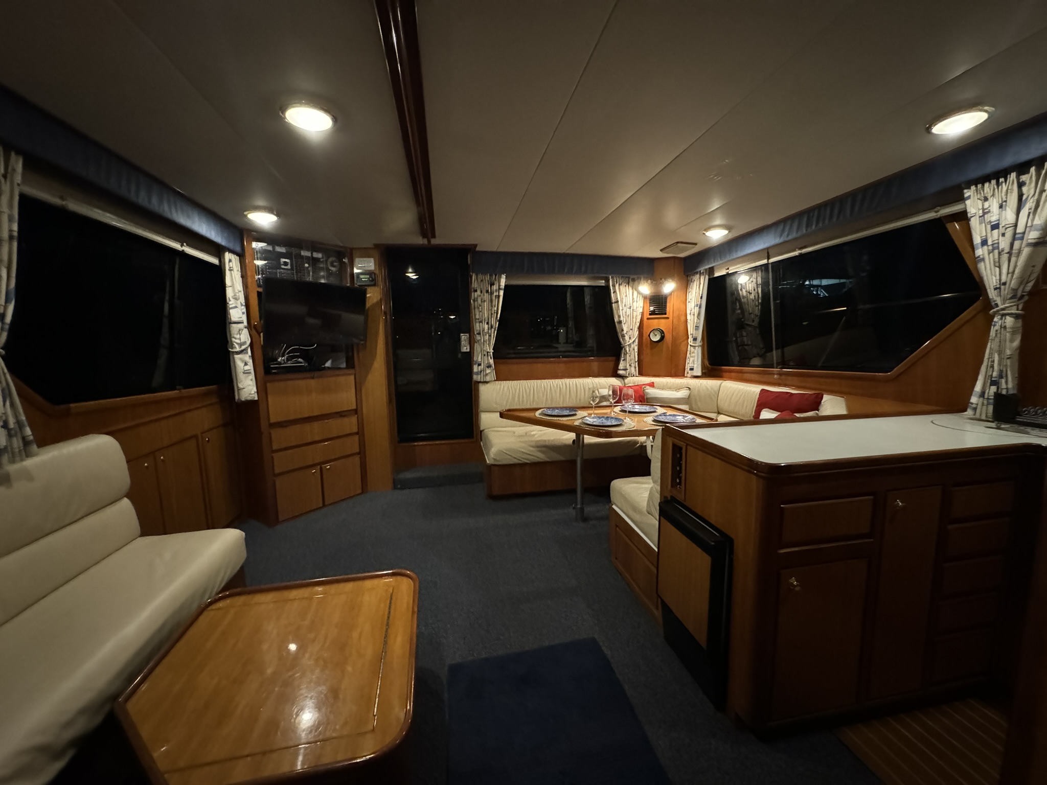 - Massive salon w/360-degree windows, U-shaped dinette (converts to berth) & L-shaped settee (converts to berth), entertainment center & large under-salon utility room