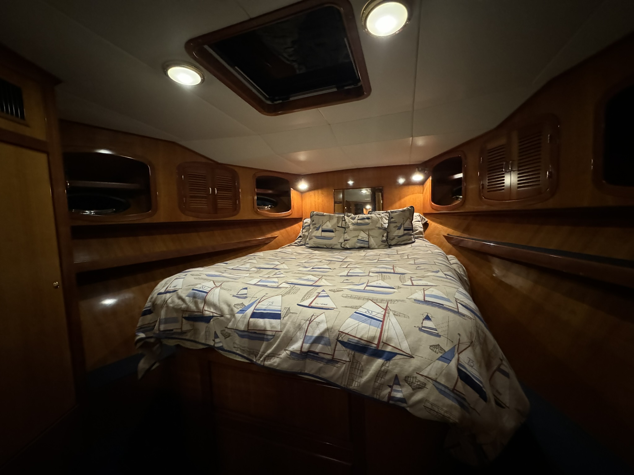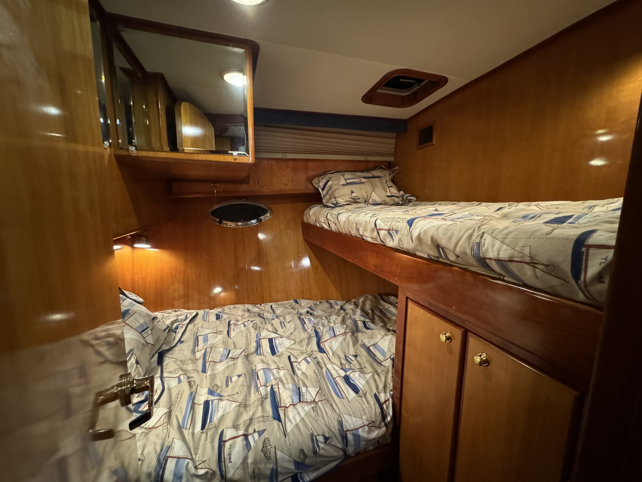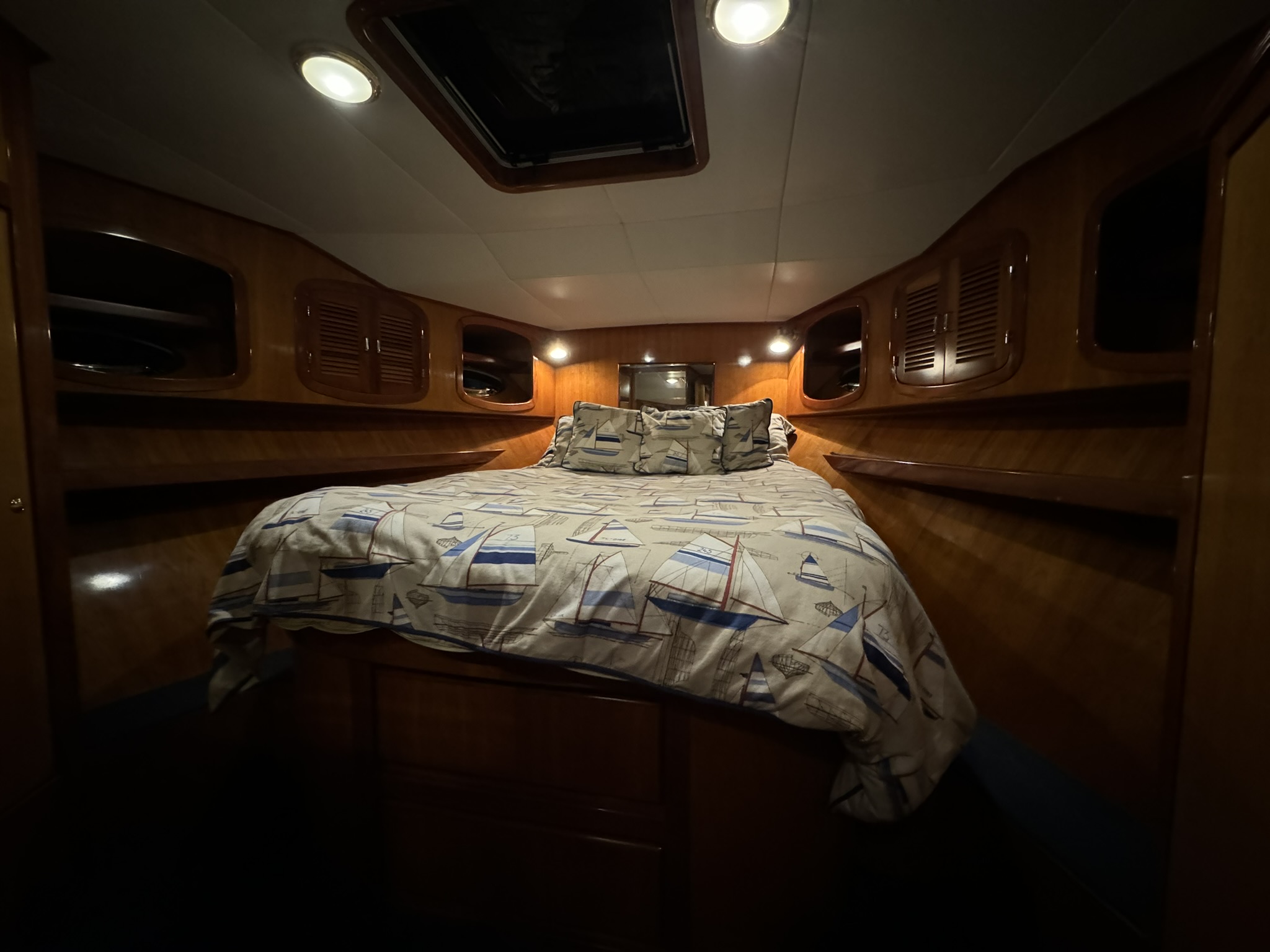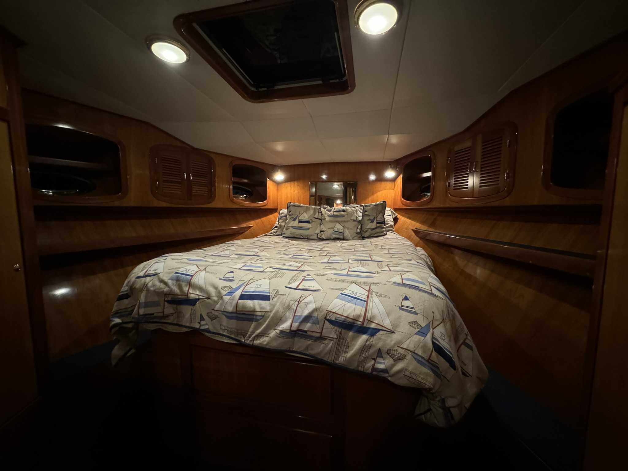 - (2) Staterooms: Master forward w/queen berth, guest stateroom mid-ship w/lower double & upper single berths