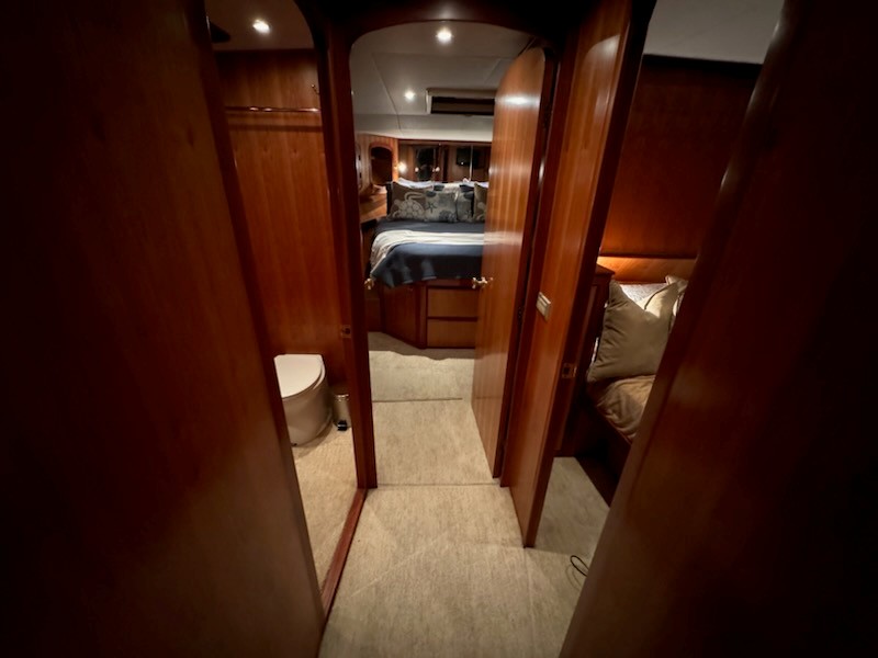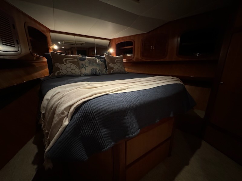 Master stateroom is forward with queen berth, private access to head w/stall shower, overhead hatch, portholes, (2) large hanging lockers, drawers & flat panel TV